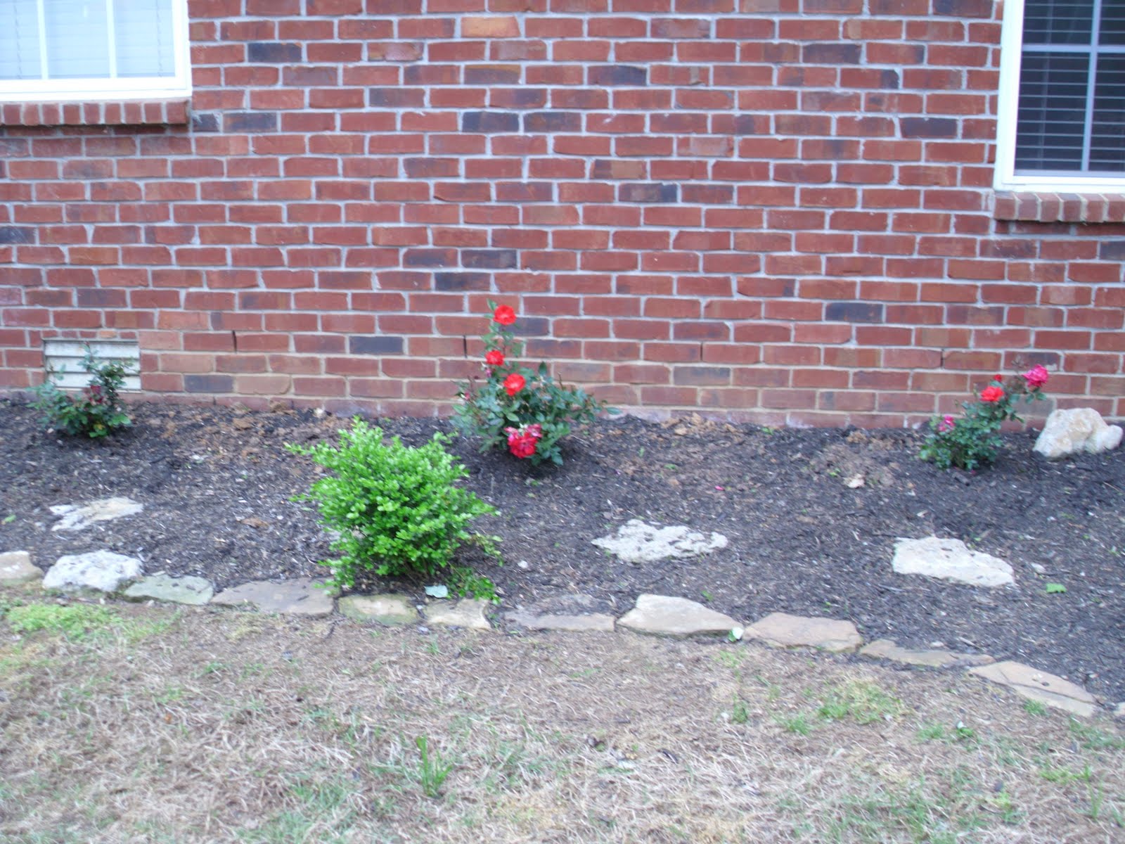 Sunday we spent the afternoon doing a little yard work. We had a big empty bed in the backyard and we finally decided to get some knockout roses to plant in it. They look small now but will be big enough soon. We were also in desperate need to trim our bushes. After the torrential downpour's Sat, they grew about a foot! I realize our big one doesn't look too pretty but after a couple weeks it will plump back up, we just had to really cut it back!